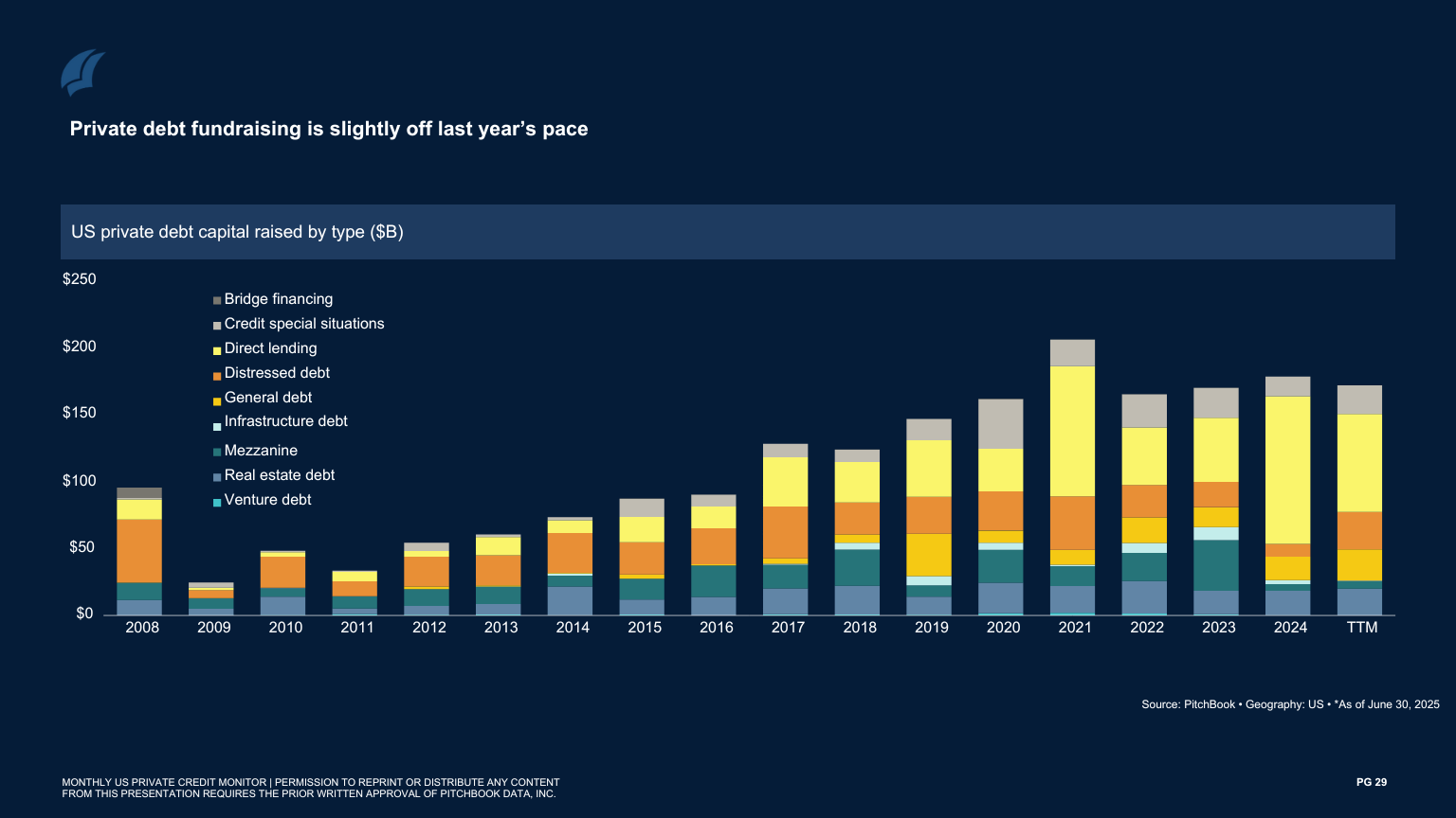 Private equity and venture fundraising slowed as LPs pulled back, but secondaries and real assets showed strength. Infrastructure funds and continuation vehicles emerged as rare bright spots.US Private Credit Monitor Sept 2025 📈