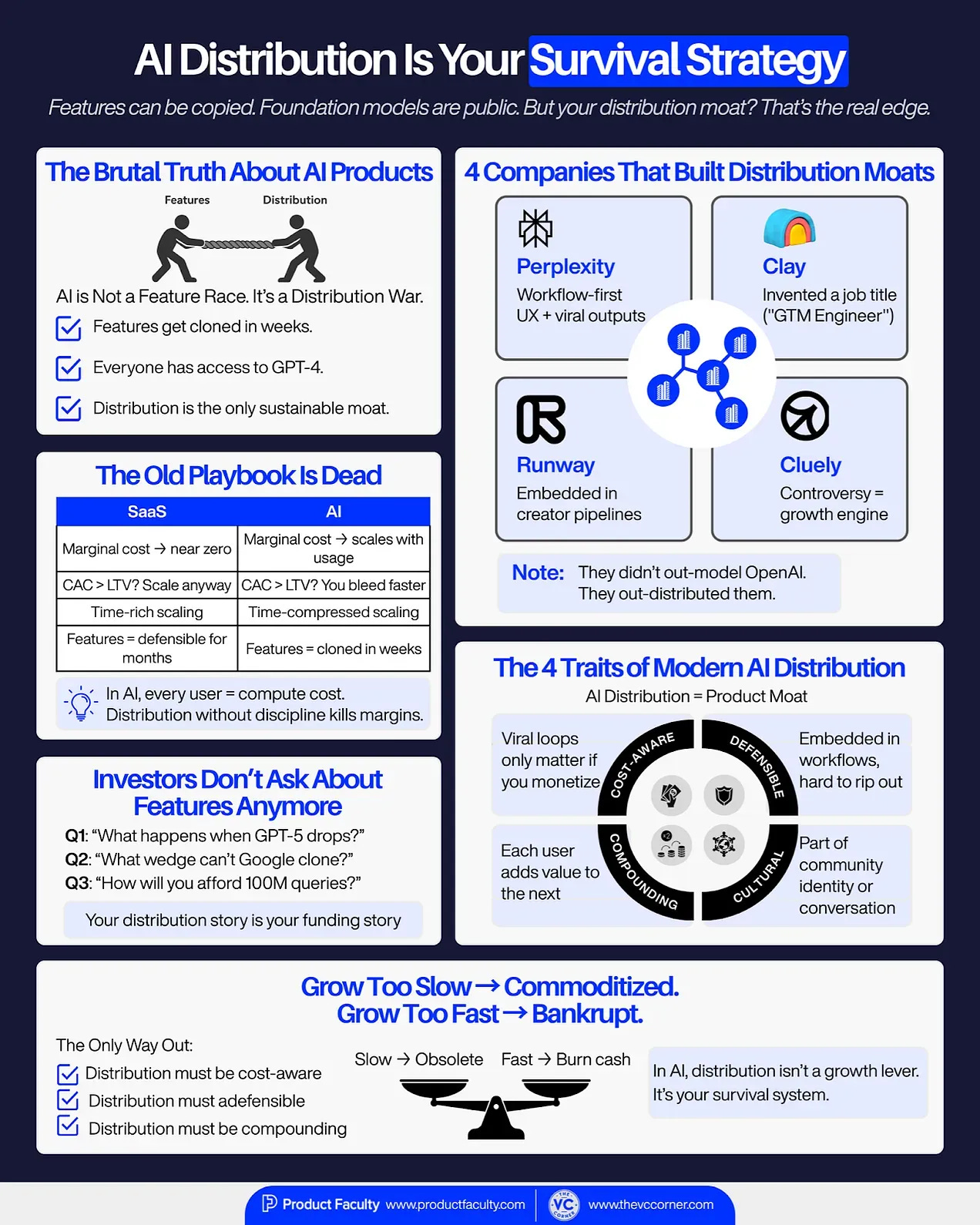 Distribution is the deciding factor in survival, not features. Fifteen plays from workflow embedding to output-as-marketing show how compounding loops create defensible positions. [Miqdad Jaffer]
