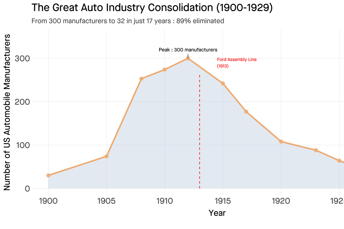 The auto industry consolidated sharply after Ford’s assembly line forced efficiency and crushed competitors, collapsing hundreds of manufacturers. AI coding assistants deliver similar 55-81% productivity gains but democratize access, letting any developer build at scale and driving new software businesses and supporting jobs. [Tomasz Tunguz]