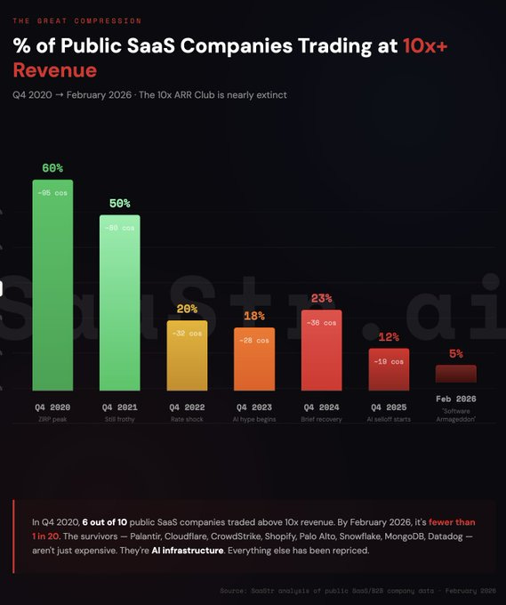 Supporters argue mega-firms reflect a market where category winners grow exponentially larger and remain private longer. Full-service ecosystems, brand gravity, and network effects now determine access to top founders. [Erik Torenberg]Public SaaS multiples compress as few remain above 10x 📉