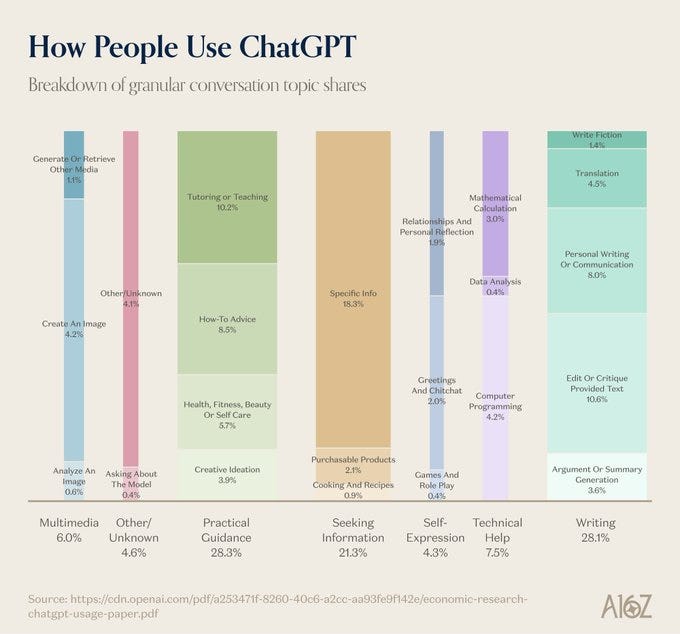 Conversation data shows research, coding help, and task guidance dominate interactions over creative experimentation. Everyday productivity use cases far outweigh multimedia or exploratory prompts. [a16z]General Catalyst bets on AI powered rollups in services 🔄