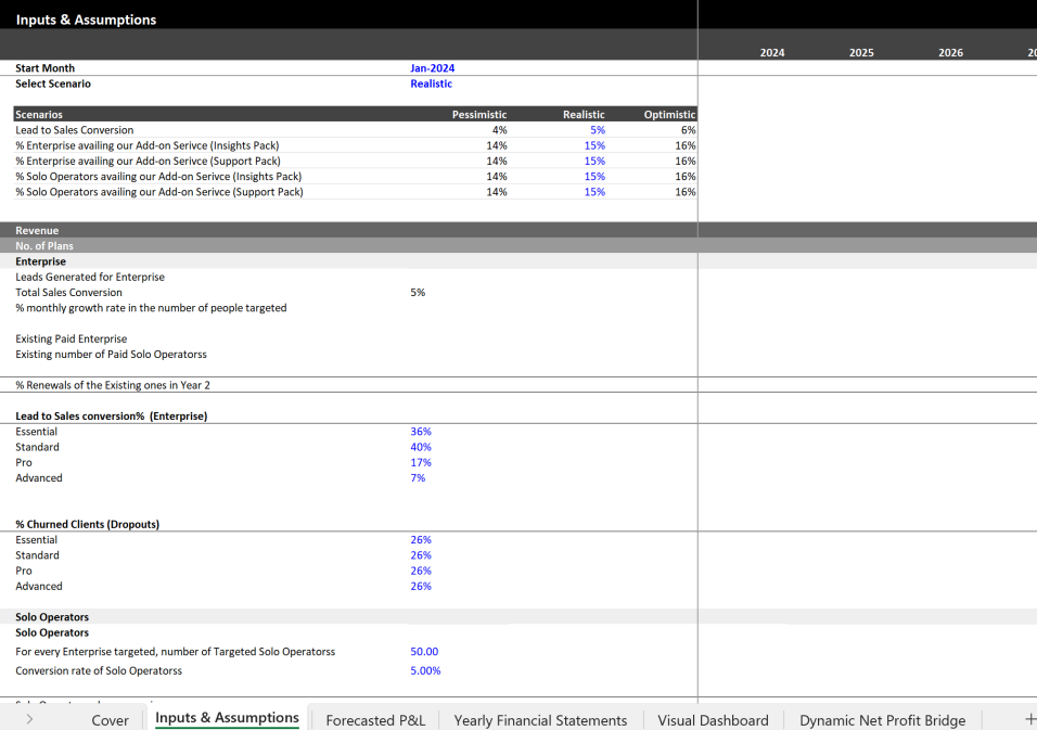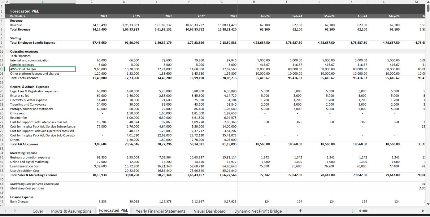 This is a complete SaaS financial model (get it at the end of the article) built to reflect how real SaaS businesses actually operate, from growth and pricing to headcount, costs, and profitability.