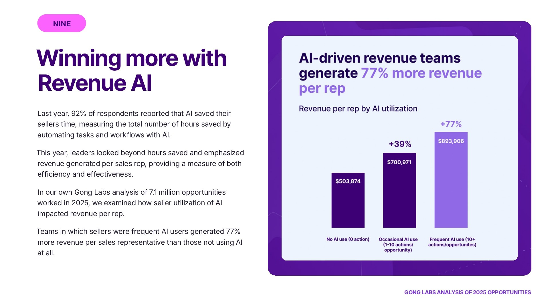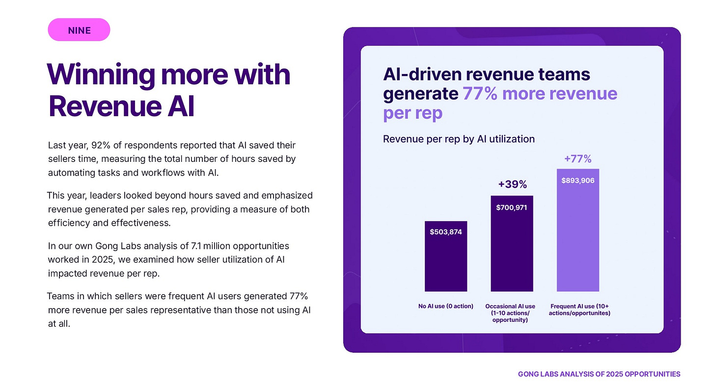 Top revenue teams focused on output per rep, deep AI adoption, and system-wide productivity instead of chasing growth through expansion. Frequent AI use and redesigned workflows drove ~77% higher revenue per rep than average teams. [Ivan Landabaso, Gong]