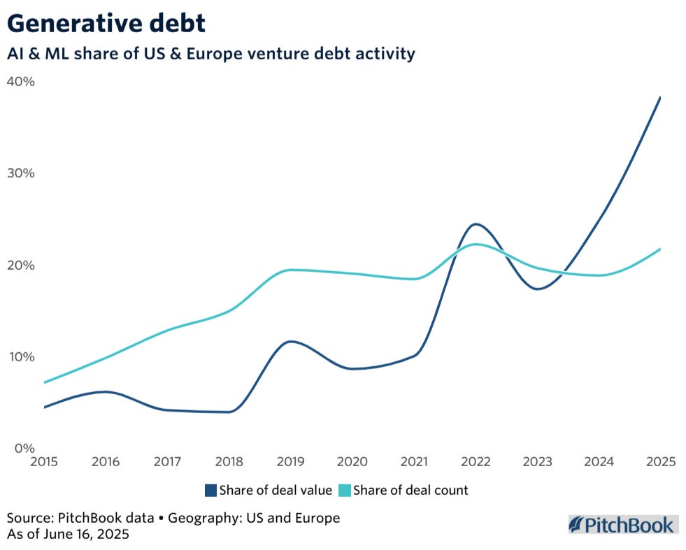 38.4% of all venture debt this year is flowing into AI startups. Why? Sky-high compute costs, big valuations, and pressure to deliver yesterday. Revenue optional.