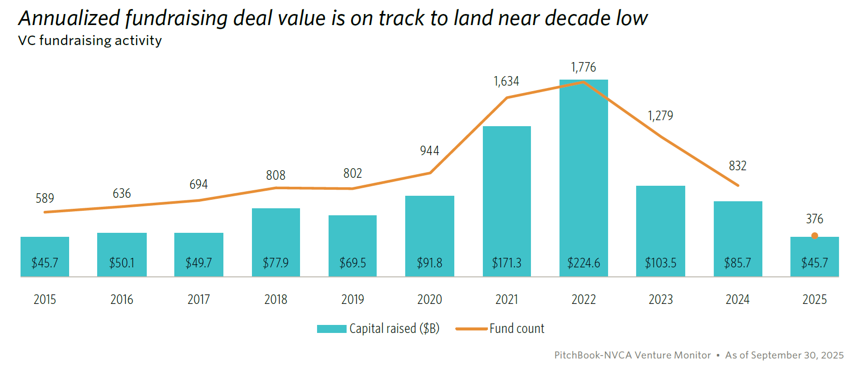 Venture capital isn’t flowing like it used to. According to PitchBook, through Q3 2025, only $45.7 billion was raised across 376 funds, putting the year on pace for one of the weakest fundraising totals of the past decade. Carta reports that as of Q2 2025, bridge rounds made up 16.6% of all VC cash raised, and that number is still climbing.