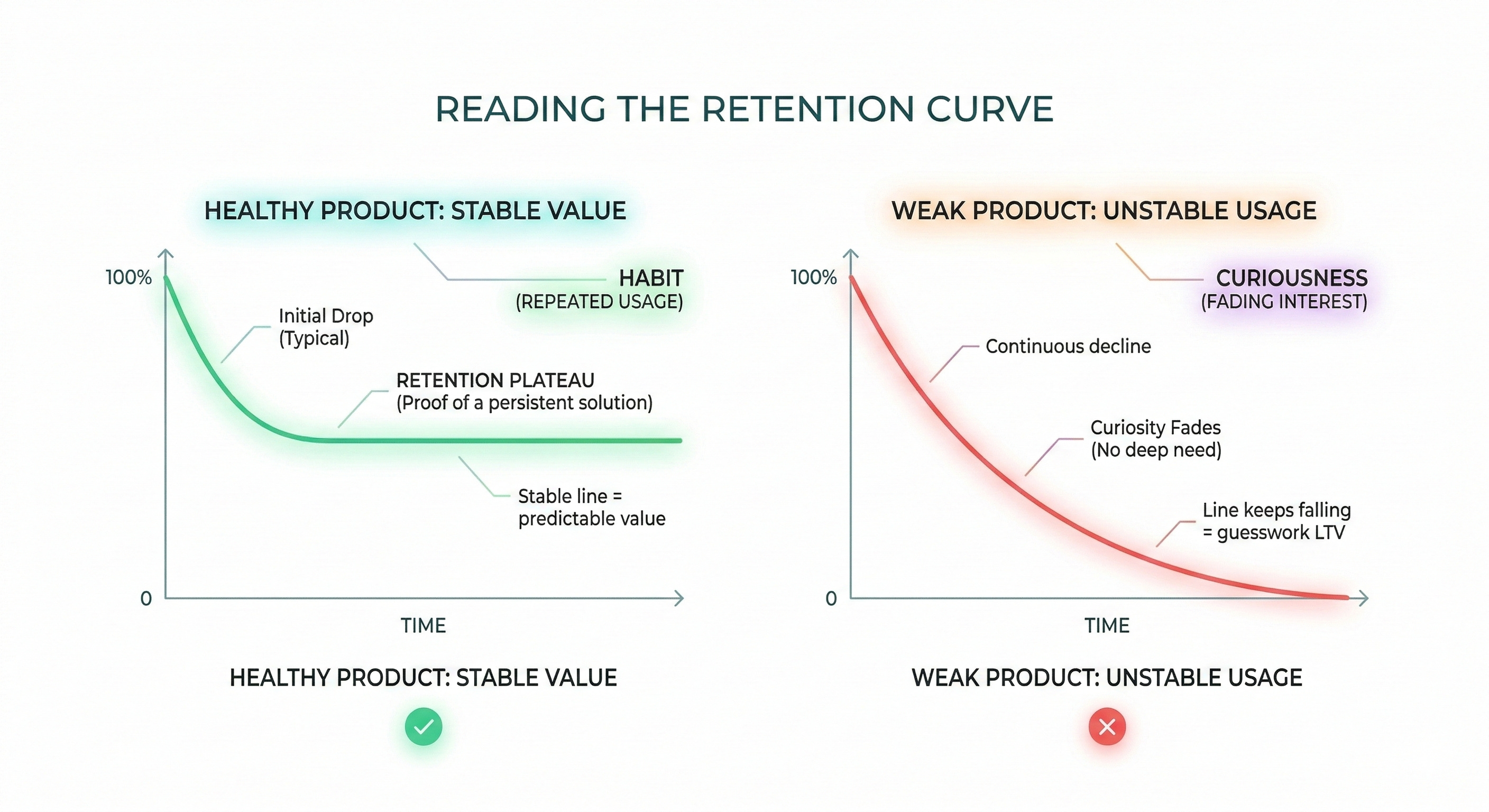 This shows that your product has become a part of their routine. If that line keeps falling toward zero, you have a product that people are curious about but do not truly need.