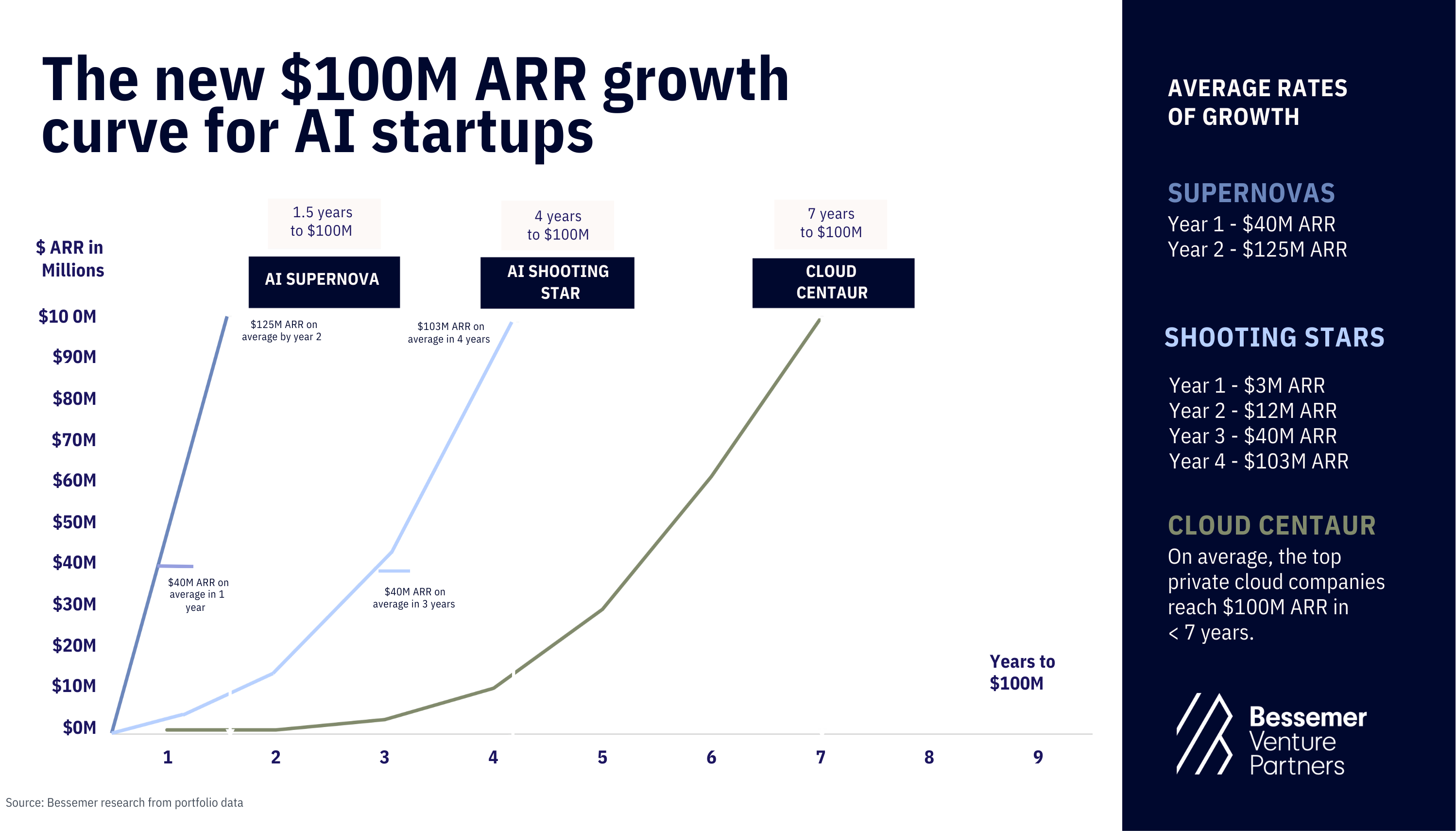 Bessemer’s AI forecast spotlights “Supernovas” and “Shooting Stars” as key growth paths. The firm sees momentum in AI browsers, generative video, data traceability, and AI-native social platforms.