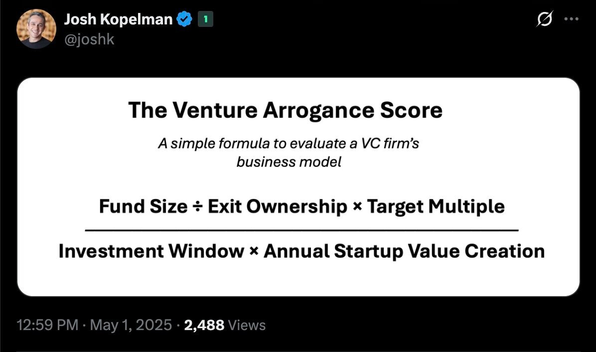 At a certain scale, a VC fund stops being a venture and starts being a beast; not because it’s more powerful, but because its target becomes mathematically impossible. That’s what Josh Kopelman’s “Venture Arrogance Score” (VAS) warns us about.