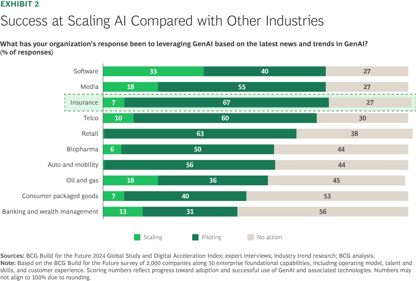 Only 7% of insurers have moved AI beyond pilots despite rich data and early adoption. Unlocking value requires cultural change, cross-functional execution, and enterprise-wide integration. [BCG]How to Nail a Big Talk ✨