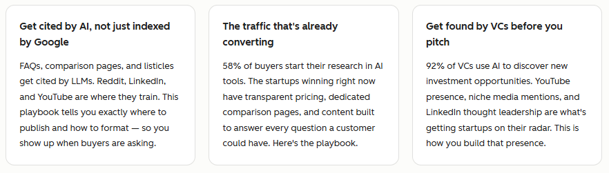 This playbook covers 4 things: how to get cited by LLMs, how to convert that traffic, how to get in front of investors, and how to attract talent — all with real tactics and data from founders who are doing it now.