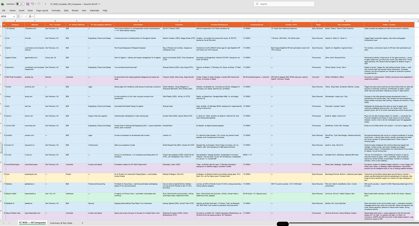 I spent weeks building what I believe is the most comprehensive public database of this batch. 196 companies. 14 data columns each. Cross-referenced from the official YC directory, Extruct.ai, Hacker News, Best of Show HN, LinkedIn, X, Crunchbase, and individual company sites.