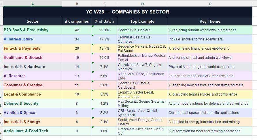 Far fewer consumer companies. Only about 5% of this batch is consumer-facing. This batch is 64% B2B, heavily weighted toward infrastructure and hard technical problems.