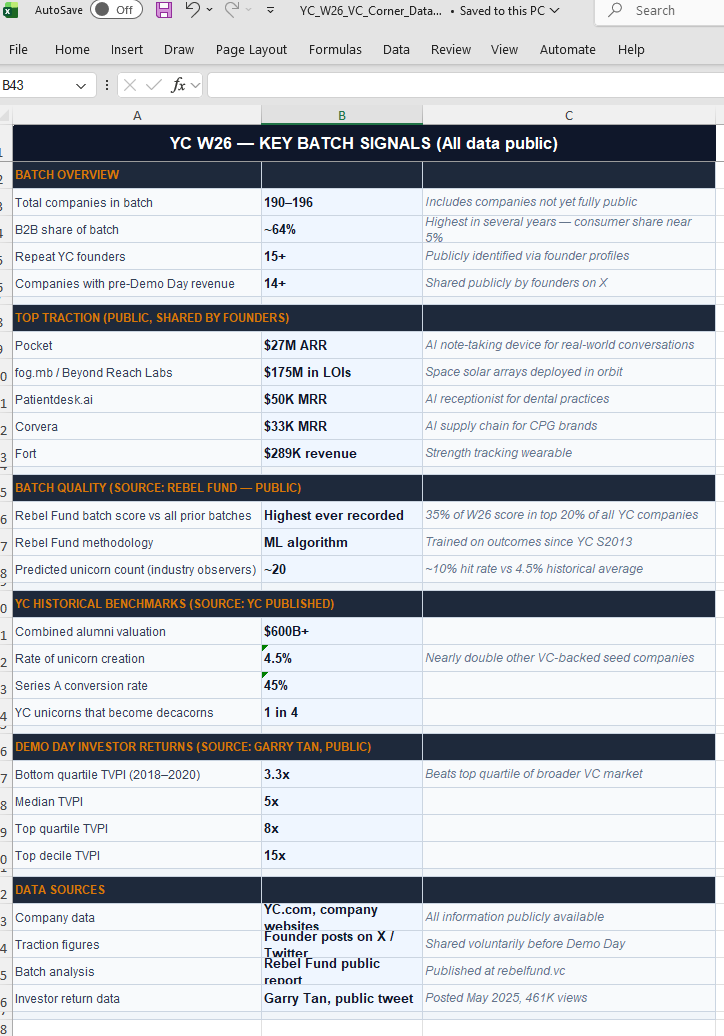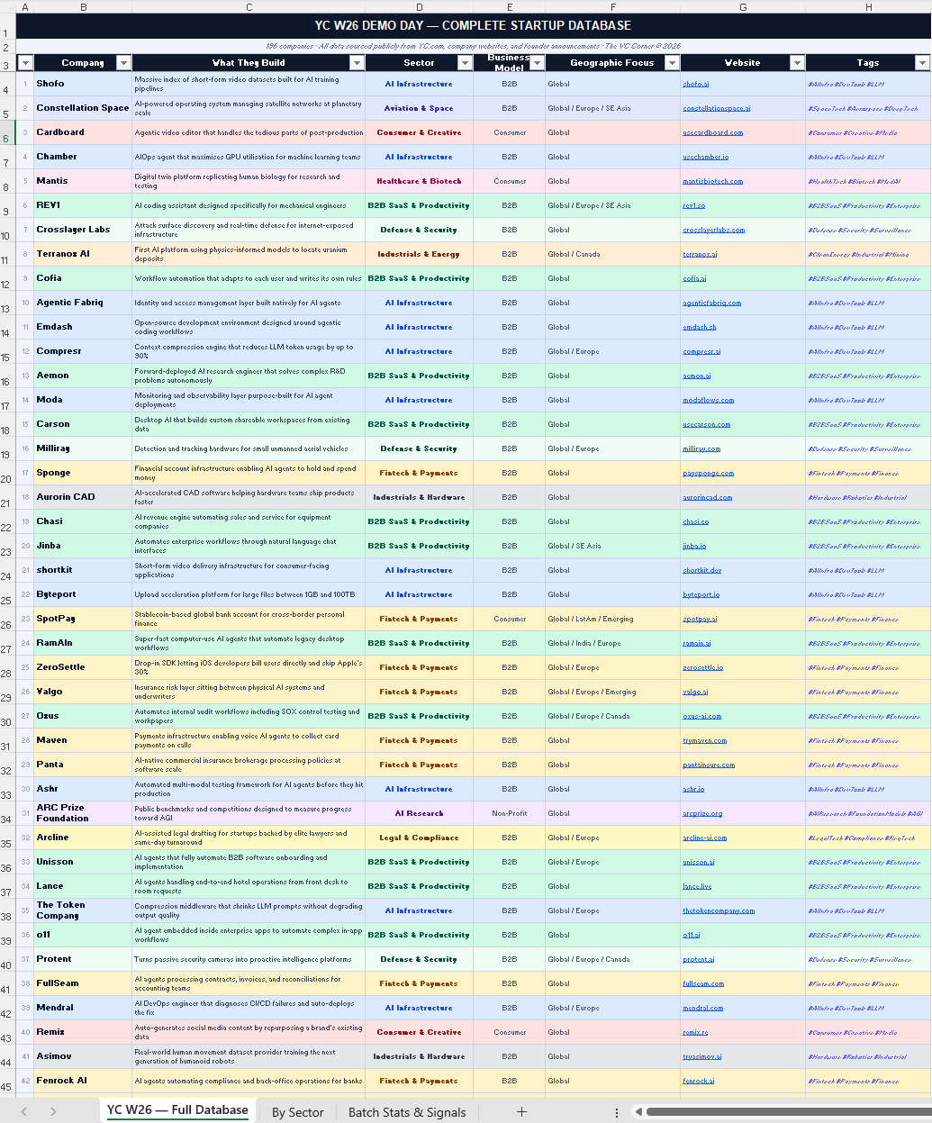 The downloadable Excel database -- every W26 company with original descriptions, sector tags, business model, geographic focus, and website. Three tabs. Built exclusively for The VC Corner: