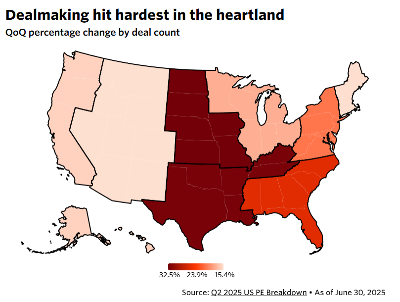 - Middle Market PE Deal Slump: Tariffs Hit the Heartland Hard 💥 - Tariffs from Trump’s “Liberation Day” hit the Midwest and South hardest, leading to a 32% drop in PE deal activity in the Midwest and a 26% drop in the Southeast. These regions, highly sensitive to trade policies, are seeing their deal pipelines shrink.